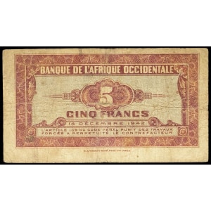AFRIQUE OCCIDENTALE FRANÇAISE - FRENCH WEST AFRICA 5 francs avec petit numéro 14 décembre 1942.…