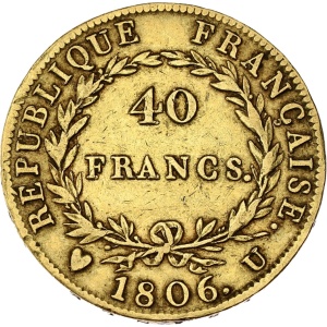 FRANCE Premier Empire / Napoléon Ier (1804-1814). 40 francs tête nue, calendrier grégorien 1806, U, Turin.…