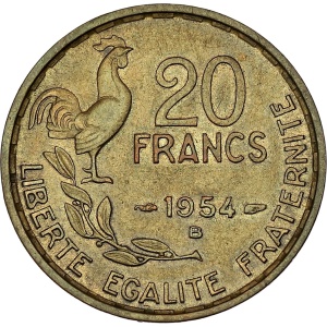 FRANCE IVe République (1947-1958). 20 francs G. Guiraud 1954, B, Beaumont-le-Roger.…