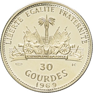 HAÏTI - HAITI République (1859- à nos jours). 30 gourdes, la citadelle, Flan bruni (PROOF) 1969 IC, Arezzo (Go…