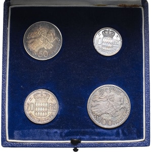 MONACO - MONACO Rainier III (1949-2005). Coffret de 4 essais-piéforts en argent [100, 50, 20 et 10 francs] 195…