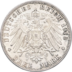 ALLEMAGNE - GERMANY Bade, Frédéric II (1907-1918). 3 (drei) mark 1912, G, Karlsruhe.…