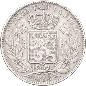 BELGIQUE - BELGIUM Léopold Ier (1831-1865). 5 francs, tête nue 1858, Bruxelles.…