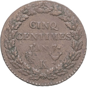 FRANCE - FRANCE Directoire (1795-1799). Cinq centimes Dupré, grand module An 7/5 (1798), K, Bordeaux.…