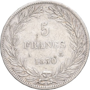 FRANCE - FRANCE Louis-Philippe Ier (1830-1848). 5 francs tête nue, tranche en relief 1830, A, Paris.…