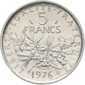 FRANCE - FRANCE Ve République (1958 à nos jours). Piéfort de 5 francs Semeuse en argent 1976, Pessac.…