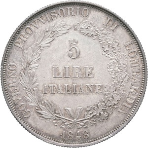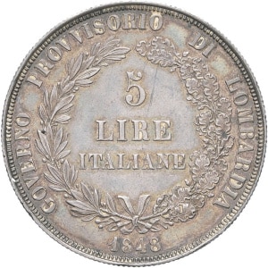 ITALIE - ITALY Lombardie, Gouvernement provisoire de (1848). 5 lire 1848, M, Milan.…