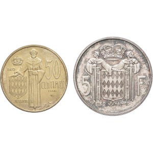 MONACO - MONACO Rainier III (1949-2005). Lot de deux essais : 5 francs et 50 centimes 1960 et 1962, Paris.…