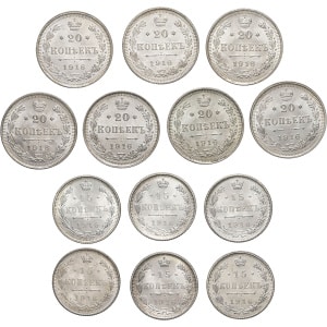 RUSSIE - RUSSIA Nicolas II (1894-1917). Lot de 13 monnaies de 15 et 20 kopeks 1916, Saint-Pétersbourg.…