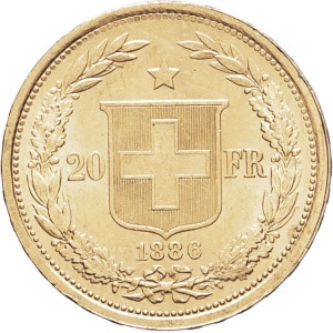SUISSE - SWITZERLAND Confédération Helvétique (1848 à nos jours). 20 francs 1886, Berne.…