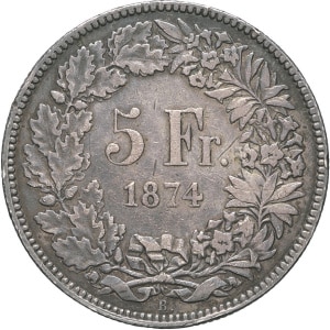 SUISSE - SWITZERLAND Confédération Helvétique (1848 à nos jours). 5 francs, Helvetia assise 1874, B., Bruxelle…
