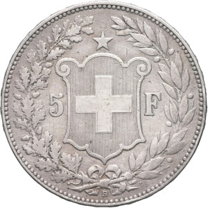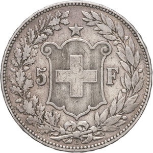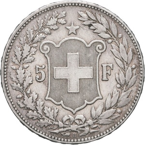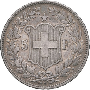 SUISSE - SWITZERLAND Confédération Helvétique (1848 à nos jours). 5 francs, tête d’Helvetia 1889, B, Berne.…
