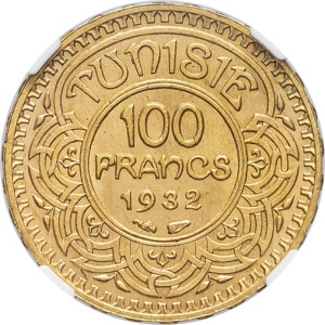 TUNISIE - TUNISIA Ahmed, Bey (1929-1942). 100 francs Or AH 1351 - 1932, Paris.