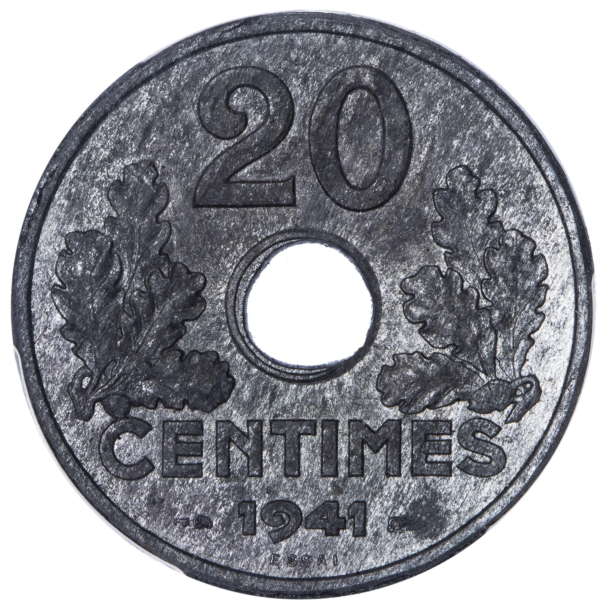 FRANCE État Français (1940-1944). Essai-piéfort de 20 centimes type 20 1941, Paris.…