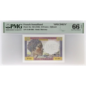 CÔTE FRANÇAISE DES SOMALIS - FRENCH SOMALILAND 10 francs SPECIMEN type “Djibouti” ND (1946).…