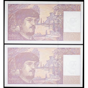 FRANCE - FRANCE Lot (2) - 20 francs type “Claude Debussy” modifié (alphabet K.064) avec numéros consécutifs 19…