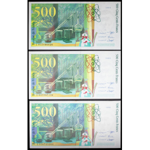 FRANCE - FRANCE Lot (3) - 500 francs type “Pierre et Marie Curie” (signatures A) 1994-1996.…