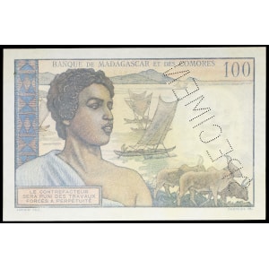 MADAGASCAR - MADAGASCAR 100 francs type “femme Hova et rova d’Antananarivo” (SPÉCIMEN) ND (1950).…