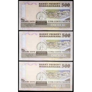 MADAGASCAR - MADAGASCAR Lot (3) - 500 francs / 100 ariary type “jeune pêcheur” avec numéros consécutifs ND (19…