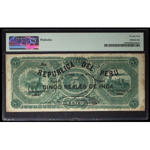 PÉROU - PERU 5 reales de Inca surchargé sur 5 soles 1er septembre 1881.