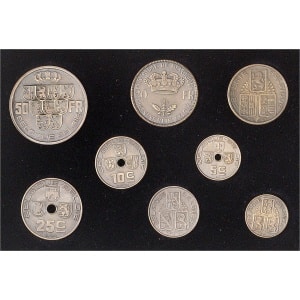 BELGIQUE - BELGIUM Léopold III (1934-1951). Coffret de 8 essais de 50, 20, 5 et 1 francs et de 50, 25, 10 et 5…
