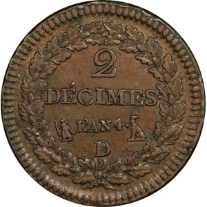 FRANCE - FRANCE Directoire (1795-1799). Décime Dupré, petit module, (refrappe) An 4 (1795), D, Lyon.…