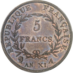 FRANCE - FRANCE Consulat (1799-1804). Essai de 5 francs, tranche lisse, concours de l’An XI, par Droz, Frappe …