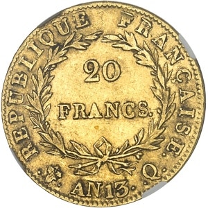 FRANCE - FRANCE Premier Empire / Napoléon Ier (1804-1814). 20 francs tête nue, calendrier révolutionnaire An 1…