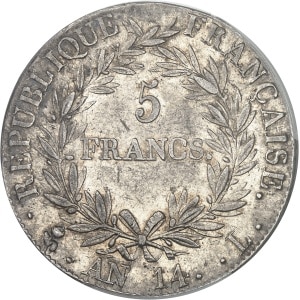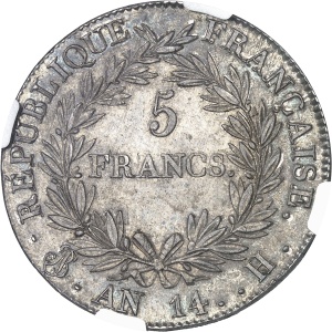 FRANCE - FRANCE Premier Empire / Napoléon Ier (1804-1814). 5 francs tête nue, calendrier révolutionnaire An 14…