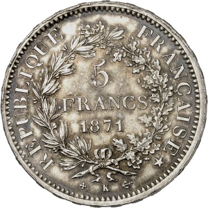 FRANCE - FRANCE Gouvernement de Défense Nationale (1870-1871). 5 francs Hercule 1871, K, Bordeaux.…