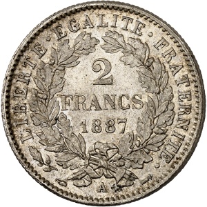 FRANCE - FRANCE IIIe République (1870-1940). 2 francs Cérès avec légende 1887, A, Paris.…