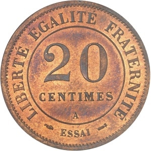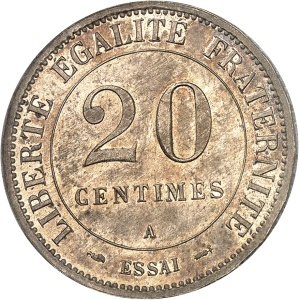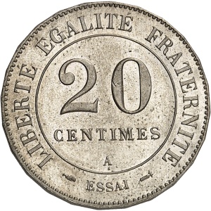 FRANCE - FRANCE IIIe République (1870-1940). Essai de 20 centimes en maillechort, d’après Lorthior, flan rond …