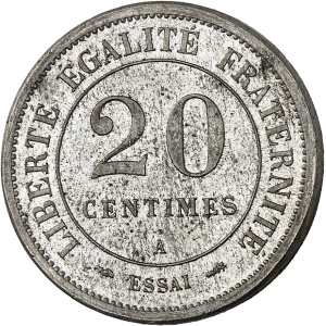 FRANCE - FRANCE IIIe République (1870-1940). Essai de 20 centimes non signée, flan rond en maillechort 1889, A…