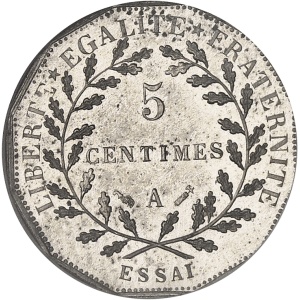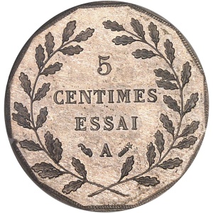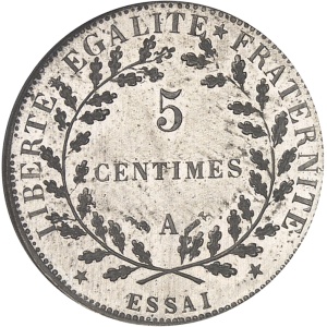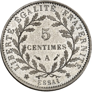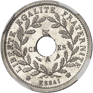 FRANCE - FRANCE IIIe République (1870-1940). Essai de 5 centimes en maillechort, 2e type, d’après Lorthior, fl…