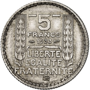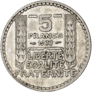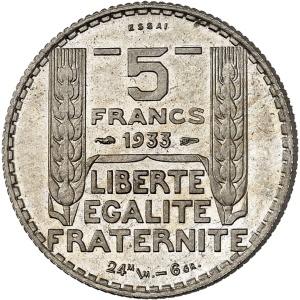 FRANCE - FRANCE IIIe République (1870-1940). Essai de 5 francs Turin en argent, Frappe spéciale (SP) 1933, Par…