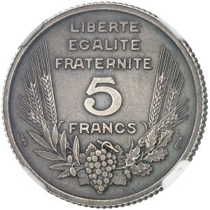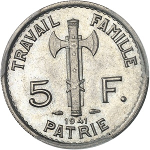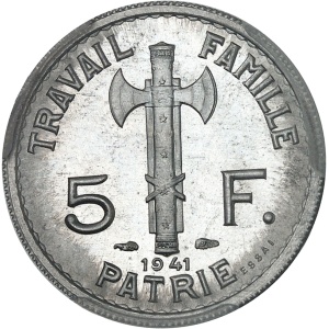 FRANCE - FRANCE État Français (1940-1944). Essai de 5 francs Pétain, type définitif, en aluminium, Frappe spéc…