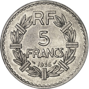 FRANCE - FRANCE IIIe République (1870-1940). 5 francs Lavrillier en nickel 1936, Paris.…