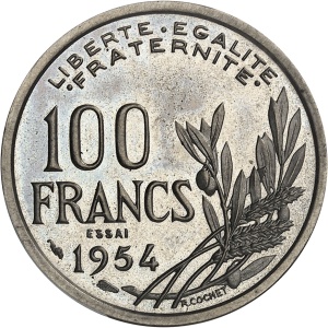 FRANCE - FRANCE IVe République (1947-1958). Essai-piéfort de 100 francs Cochet, tranche lisse, Frappe spéciale…