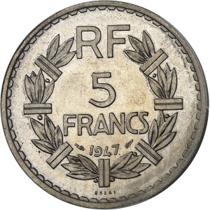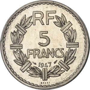 FRANCE - FRANCE IVe République (1947-1958). Essai de 5 francs Lavrillier en cupro-nickel, de poids 11 g, Frapp…