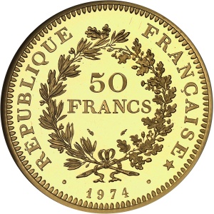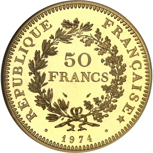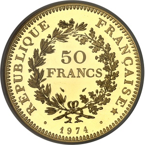 FRANCE - FRANCE Ve République (1958 à nos jours). Piéfort de 50 francs Hercule en or, Flan bruni (PROOF) 1974,…