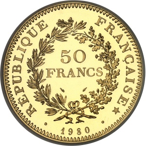 FRANCE - FRANCE Ve République (1958 à nos jours). Piéfort de 50 francs Hercule en or, Frappe spéciale (SP) 197…