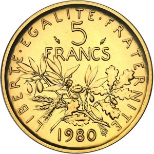 FRANCE - FRANCE Ve République (1958 à nos jours). Piéfort de 5 francs Semeuse en or, Frappe spéciale (SP) 1980…
