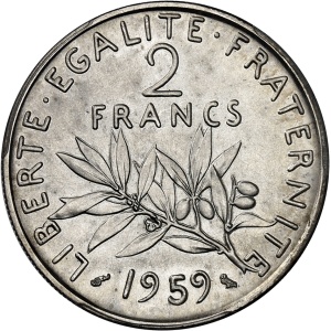 FRANCE - FRANCE Ve République (1958 à nos jours). Essai de 2 francs Semeuse, Frappe spéciale (SP) 1959, Paris.…