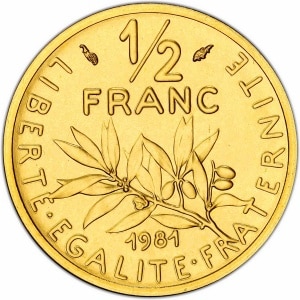 FRANCE - FRANCE Ve République (1958 à nos jours). Piéfort de 1/2 franc Semeuse en or, Frappe spéciale (SP) 198…