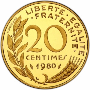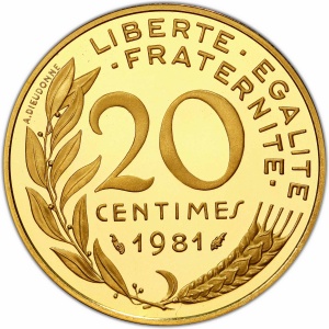 FRANCE - FRANCE Ve République (1958 à nos jours). Piéfort de 20 centimes Marianne en or, Frappe spéciale (SP) …