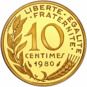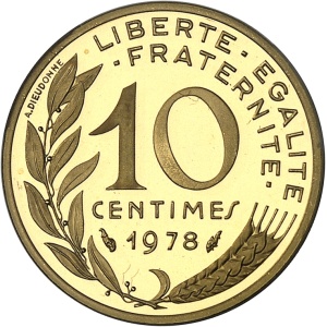 FRANCE - FRANCE Ve République (1958 à nos jours). Piéfort de 10 centimes Marianne en or, Frappe spéciale (SP) …