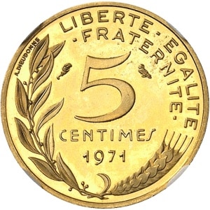 FRANCE - FRANCE Ve République (1958 à nos jours). Piéfort de 5 centimes Marianne en or, Flan bruni (PROOF) 197…