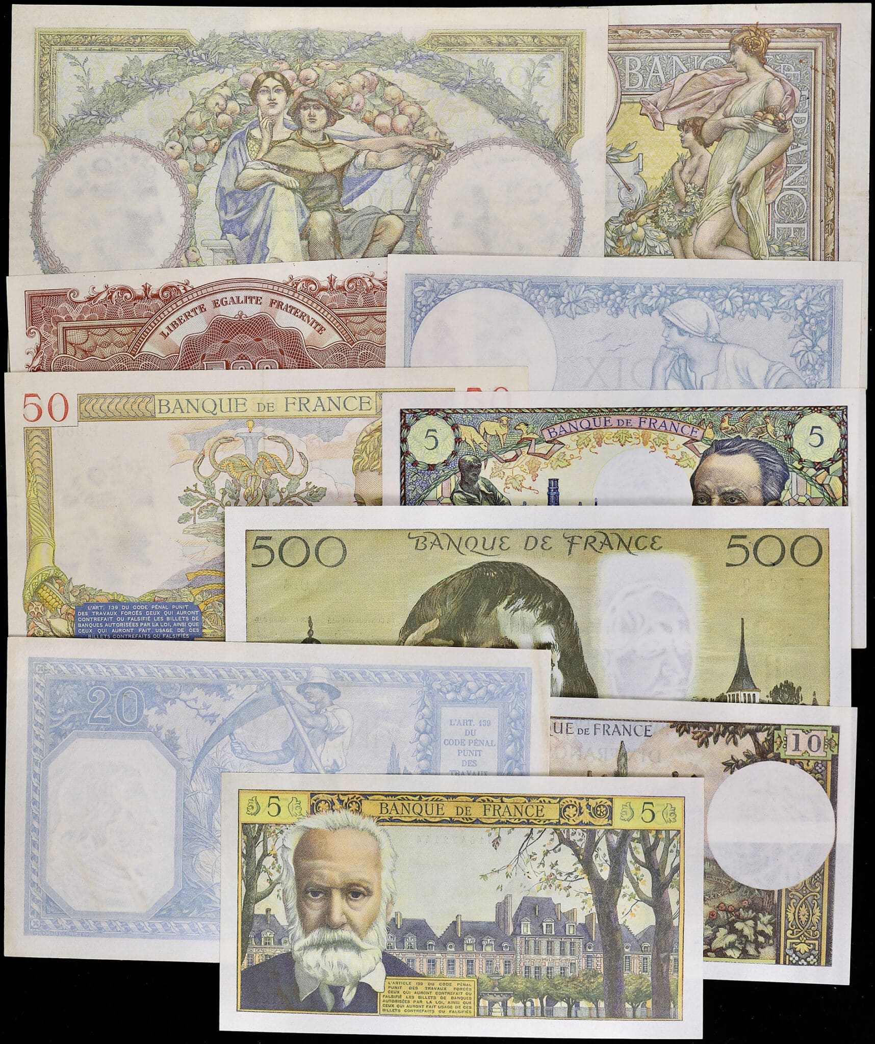 Lot (10) - billets de la banque de France avec : 100 francs Luc Olivier Merson sans LOM du 12-8-1911, type rare et recherché (état TB+ avec plis et épinglages), 10 francs type Minerve du 17-12-1936 (état SPL, non épinglé), 20 francs type Bayard du 21-12-1918 (état TTB, légèrement aplati et petites rousseurs), 50 francs type LOM du 1-6-1928, type recherché premier type (état TTB, sans coupure et 2/3 épinglages seulement avec 5 trous), 50 francs type Cérès modifié du 2-2-1939 (état TTB+ avec plis et une petite coupure en marge blanche à 9h), 5 nouveaux francs type Victor Hugo du 1-10-1964 (état SUP, sans épinglage mais deux plis verticaux et légèrement aplati) ,5 francs type Pasteur du 8-1-1970, c'est la dernière date (état SUP+ avec un pli central et un épinglage soit 2 trous), 10 francs type Voltaire du 4-4-1963 (état SUP avec deux épinglages (4 trous), deux plis centraux et un pli de comptage), 500 francs type Pascal du 4-1-1968, c'est la première date pour ce type (état SUP avec deux épinglages soit 4 trous, plis de comptage au niveau des deux angles supérieurs et traces de manipulation, mais le papier est frais et craquant) et un 500 francs Marianne type "Trésor" de 1945 (état SPL avec infime trous en marge haute et deux petits trous en marge inférieur côté angle gauche, sinon le papier est dans un état magnifique).