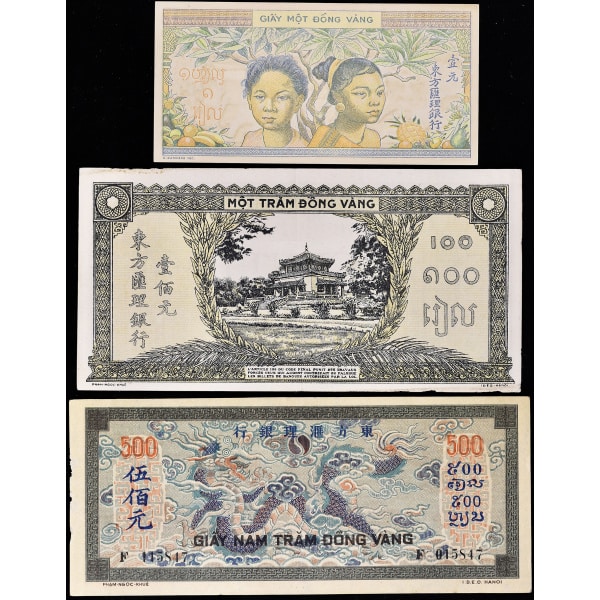 - FRENCH INDOCHINA Lot (3) - 1 piastre, 100 piastres type “orange” et 500 piastres type “gris-vert” ND (1942/1945).