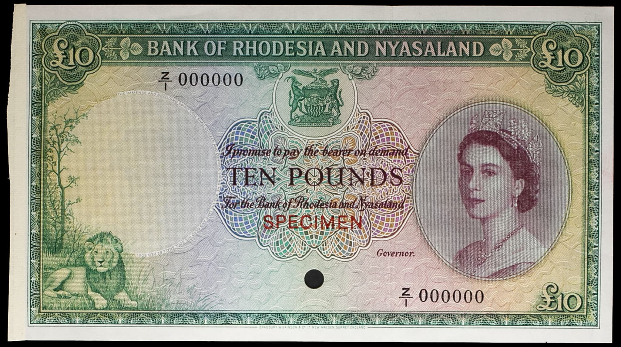 - RHODESIA AND NYASSALAND 10 pounds avec le portrait de la reine Élisabeth II (SPÉCIMEN) ND (1956-61).